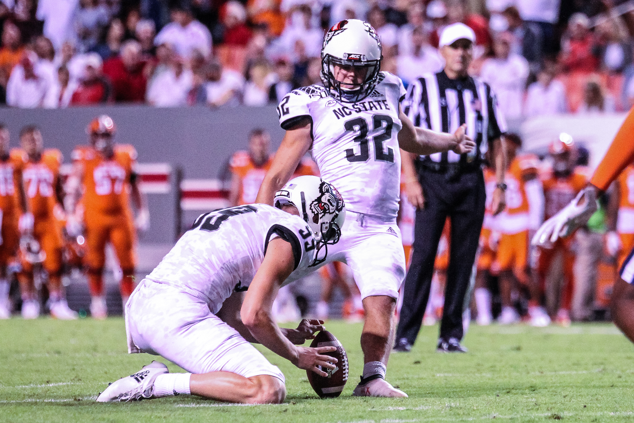 Wolfpack kicker Christopher Dunn converts a field goal attempt. He finished with three made field goals with a long of 43 yards. Image courtesy of Lawrence Davis. - After escaping pressure for an eternity, Leary barely got the ball away. He had Thomas wide open downfield for a would-be touchdown