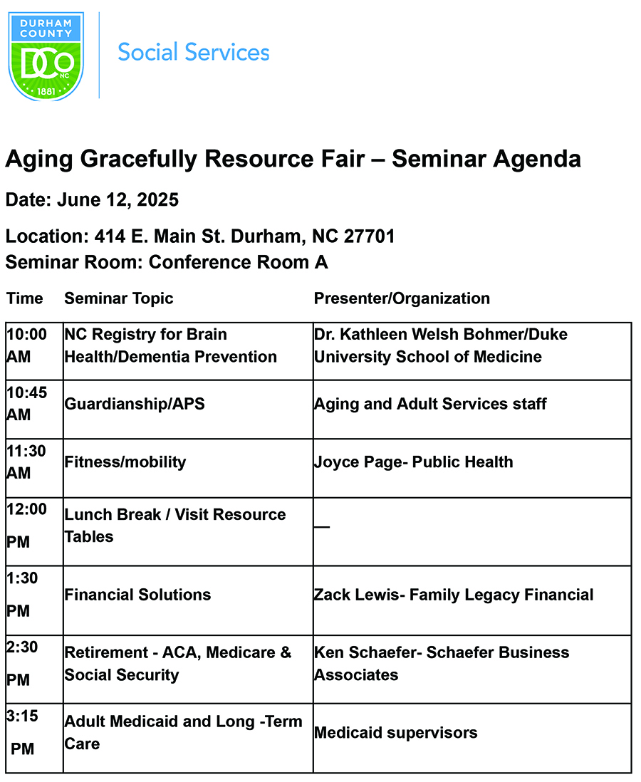 “This event makes it easy for seniors and their loved ones to get the answers they need—without the frustration of endless phone calls or trying to figure things out online,” said Maggie Clapp, Director of Durham County DSS. “We’re bringing together public and private organizations from across the Triangle to support our community.”